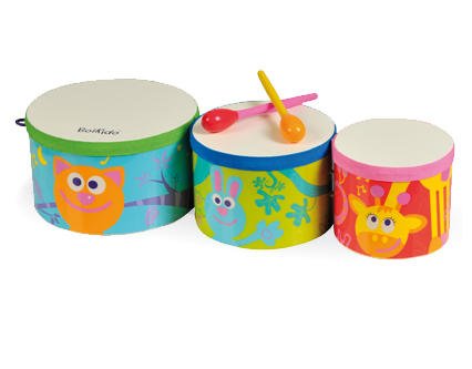 3 beautiful wooden drums in different diameters to create unique sounds and melodies. Perfect for musical sense awakening and for developing rhythm. Includes 2 drumsticks.